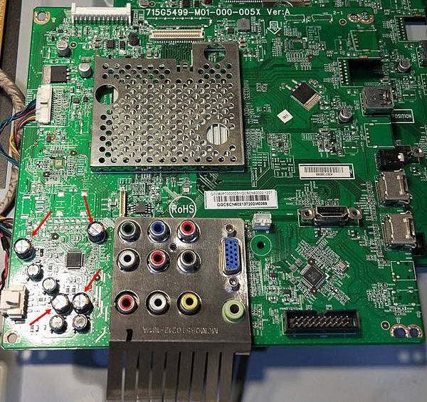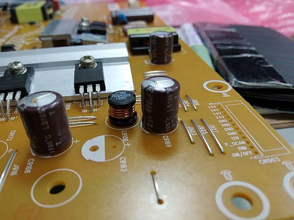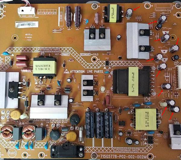 看了三年多的 奇美 TL-50LS70 忽然無法開機,待機有亮紅燈,遙控器按一下,紅燈閃一下,但就是不能開機,把電視拆開檢查,發現電源板 715G5778 上面有電容爆漿了,型號是470u 25V 五顆,找了470u 35v 來換上,要注意高度,如果太高就要讓電容倒下,以免跟後殼干涉,換好之後測試能開機,復原後爽爽看了一天,